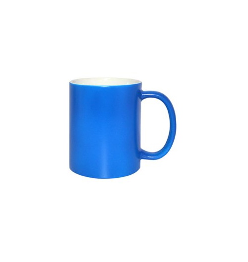 • Błyszczący, niebieski, neonowy kubek do sublimacji z białym wnętrzem oraz wygodnym, kolorowym uchem