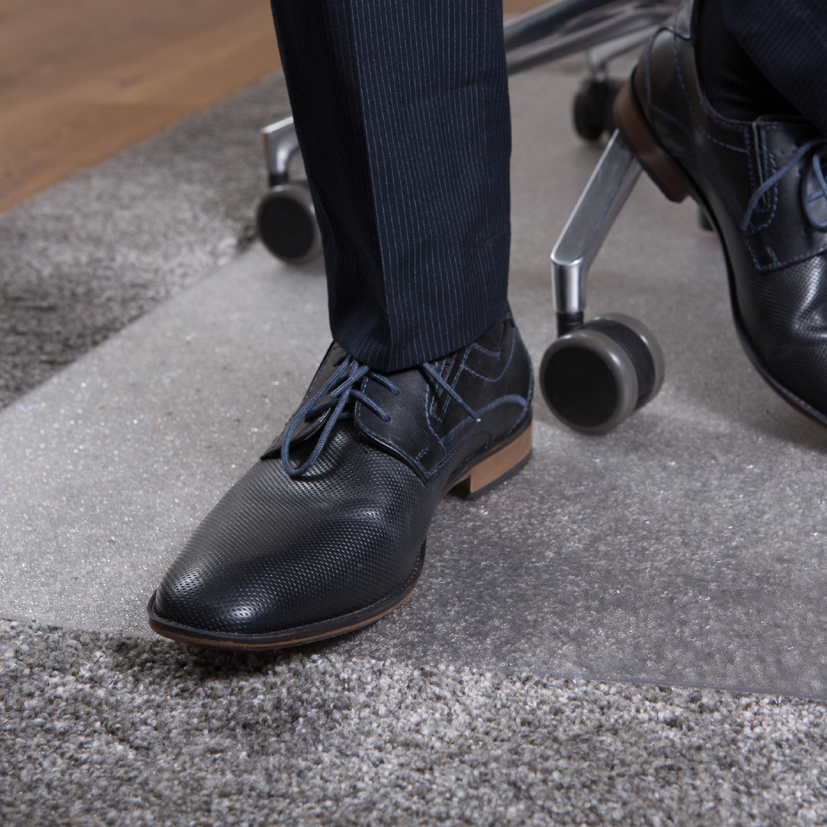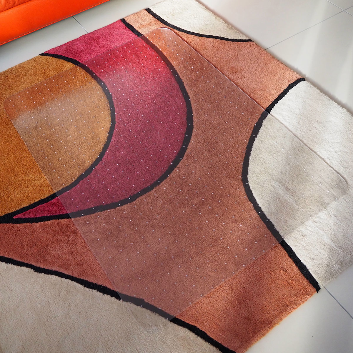 • Przezroczysta mata podłogowa pod krzesła z zaokrąglonymi rogami o wymiarach 120 x 130 cm