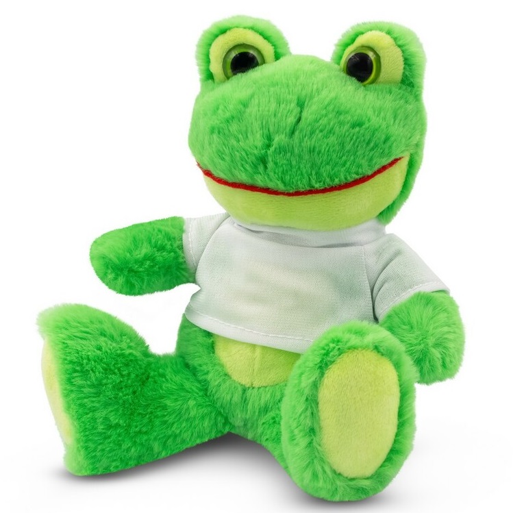 - Zielona żaba z białą koszulką do sublimacji ma wysokość 16 cm