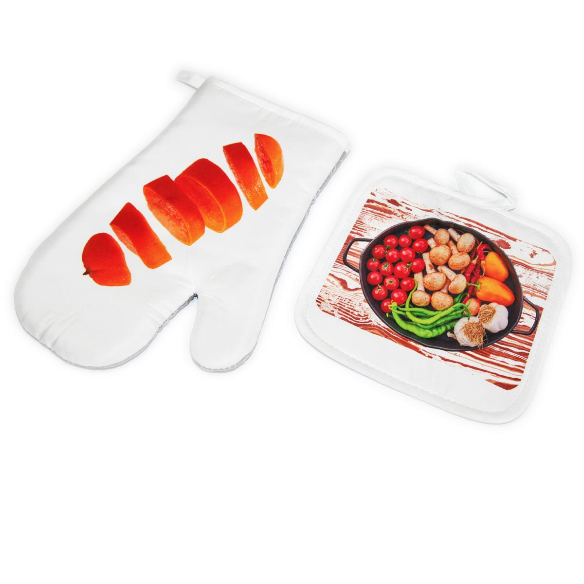 • Żaroodporna rękawica i ściereczka pod zadruk sublimacyjny posiadają pętelki, przy pomocy których można zawiesić zestaw w kuchni na haczyku